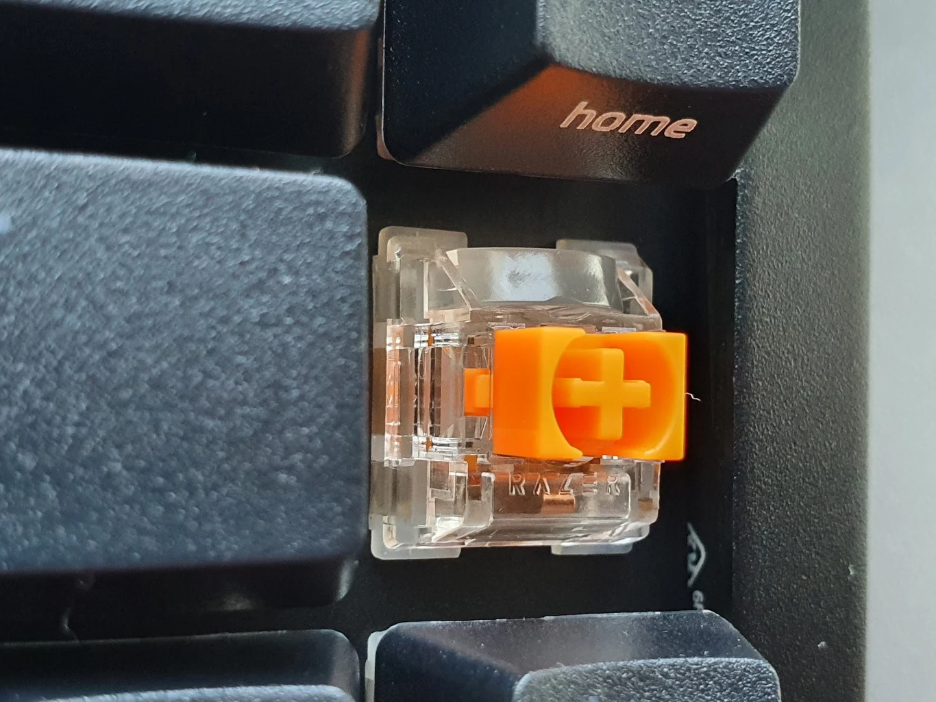 BlackWidow V4 75% wyposażono w trzecią generację przełączników Razer Orange Tactile. Przełączniki te są nieco cięższe niż popularne Cherry MX Brown (50g vs 45g), co sprawia, że oferują bardziej wyczuwalny skok.