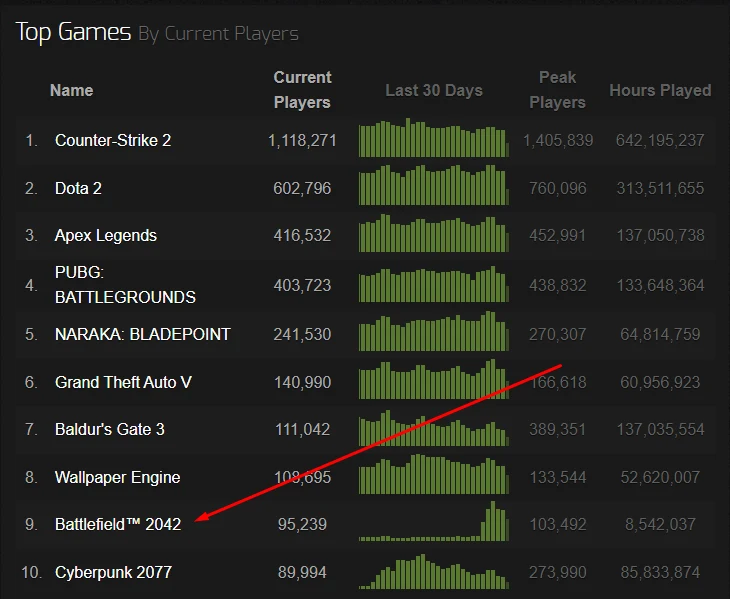 W rezultacie Battlefield 2042 może pochwalić się teraz rewelacyjnymi wynikami. Codziennie w peaku obserwujemy blisko 100 tys. jednocześnie grających. Dodatkowo tytuł figuruje w elicie dziesięciu najchętniej ogrywanych produkcji na Steamie.