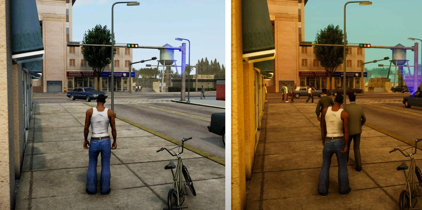 Porównanie trwa ponad 17 minut i podlega jej wiele momentów na mapie, by dokładnie porównać różnice w oświetleniu. Trzeba przyznać, że po najnowszej aktualizacji świat gry w Trylogii wygląda zupełnie inaczej. San Andreas czy Vice City nabrały zupełnie nowych barw. Nie dotyczy to jednak wyłącznie barw nieba czy budynków, ale także postaci. Są one teraz znacznie bardziej wyraźnie i modele lepiej wyglądają, niż przed aktualizacją. Jednak nie wszystko co wiąże się z nowym patchem jest wyłącznie pozytywne.