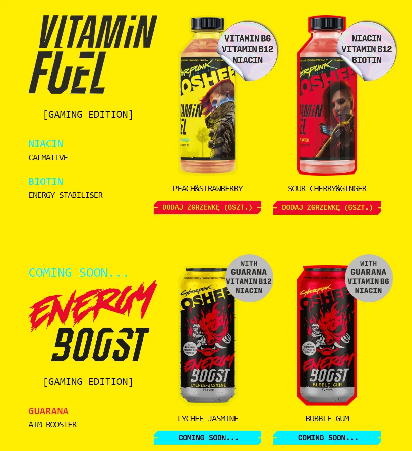 Z tej racji OSHEE nawiązało kolejną już współpracę z firmą CD Projekt RED. W internetowym sklepie można już zakupić szereg dedykowanych funkcjonalnych napojów inspirowanych światem gry Cyberpunk 2077. 12 października, produkty pojawią się także w sieci Kaufland, a kilka dni później w innych największych centrach handlowych.
