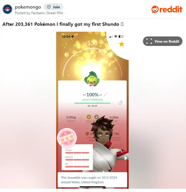 Dodatkową ciekawostką w tej historii jest fakt, że Sewaddle zostało złapane podczas Community Day - wydarzenia, które odbyło się 5 października. Była to pierwsza okazja, kiedy gracze mogli zdobyć błyszczącą wersję Sewaddle oraz jego ewolucje. Dzięki temu złapany przez gracza pokemon jest jednym z pierwszych tego rodzaju okazów w grze. A więc raz jeszcze: złapany okaz jest wyjątkowy. Naprawdę wyjątkowy.