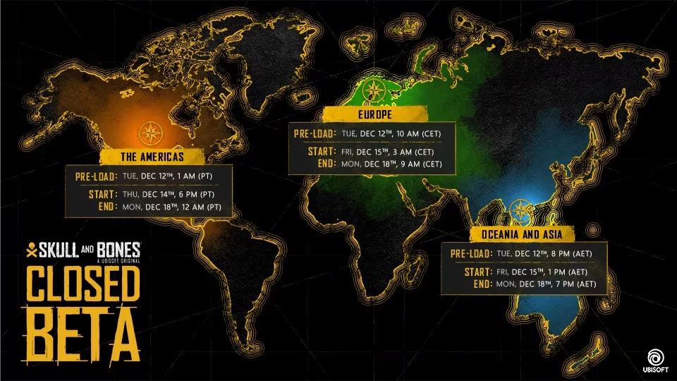 Beta testy Skull & Bones potrwają od 15 do 18 grudnia 2023 roku. Serwery mają zostać otwarte o 3:00, a zamknięte o 9:00. Ponadto, od 12 grudnia, od godziny 10:00 będzie można zacząć pobierać zawartość bety, aby zalogować się do gry zaraz po jej uruchomieniu. Testy będą dostępne na PC (Ubisoft Connect oraz Epic), PlayStation 5 i Xbox Series X/S. Subskrypcja PS+ oraz Xbox Live nie będzie potrzebna, aby wziąć udział w becie.