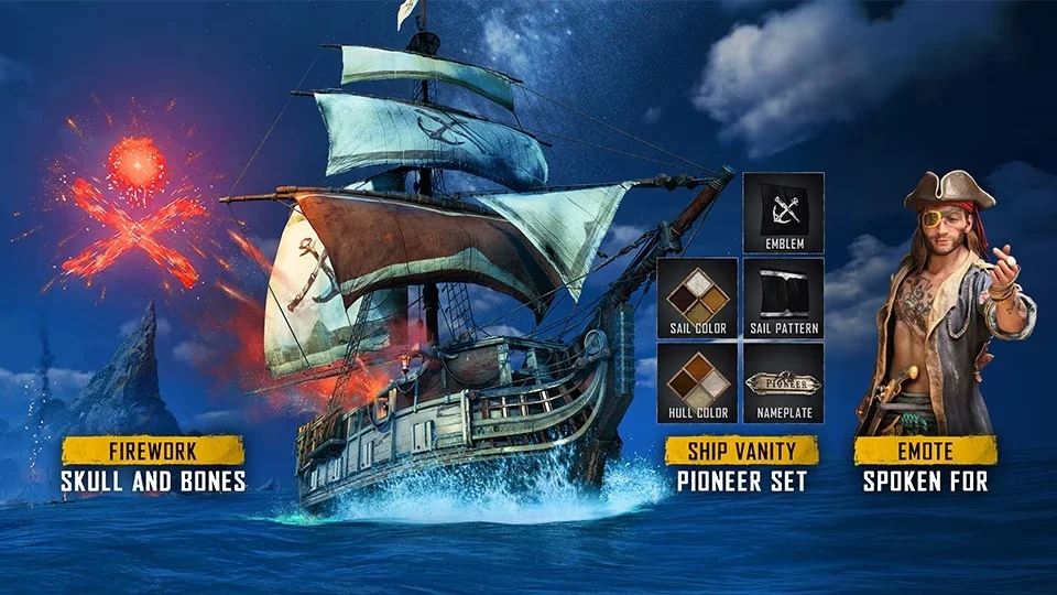 W ręce uczestników beta testów trafią powyższe nagrody. Są to kosmetyczne atrakcje, które pozwolą zmodyfikować nieco naszego pirata oraz statek w Skull & Bones. Większość z nich odblokowana zostanie po ukończeniu World Eventu. Fajerwerki trafią do nas z kolei po spędzeniu w becie pełnych sześciu godzin, a emotką Spoken For nagrodzeni zostaniemy po wypłynięciu na morze statkiem Bedar.
