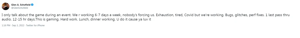 W ostatnim wpisie na Twitterze, który jednak już został usunięty, Glen Schofield napisał, że twórcy pracują nad projektem po 6-7 dni w tygodniu, a w przełożeniu daje to od 12 do 15 godzin na dobę. Jak jednak dodał sam pomysłodawca gry, pracownicy wszystko mają robić z własnej woli.