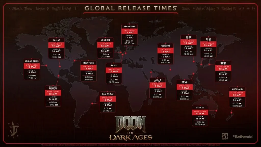 W Polsce wczesny dostęp do Doom: The Dark Ages zostanie uruchomiony o 2:00. Powyżej możecie zobaczyć dodatkowo mapę z godzinami premier w poszczególnych regionach świata.