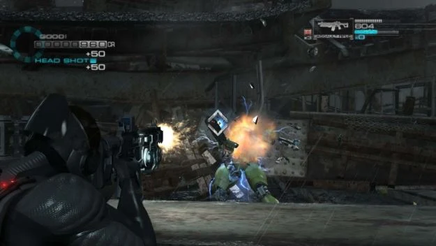 Następnym ciekawym rozwiązaniem (choć już nie tak innowacyjnym, jak rozmowy z ekipą) w Binary Domain jest punktowanie naszych poczynań w trakcie strzelanin. Nasze strzały są przeliczane na kredyty, za które później możemy modyfikować broń oraz wszczepiać sobie chipy, np. zwiększające ilość zdrowia bohatera. Nanomodyfikacji nie możemy dokonywać do woli. Jesteśmy ograniczeni prostokątem o wymiarach trzy na dwa pola, a każdy chip ma określony rozmiar i kształt. Musimy więc kombinować.