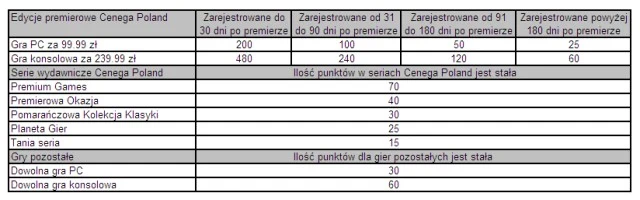 O ile powyższe liczby będą stałe i niezmienne, postanowiono zmodyfikować nieco system przyznawania punktów za rejestrację gier wydawanych nakładem Cenegi - podobnie, jak w przypadku CDPROgramu CD Projektu, ich liczba zostanie uzależniona od daty rejestracji. Najwięcej więc zyskamy, jeśli zarejestrujemy naszą grę do 30 dni od jej premiery. Tabelkę prezentującą nowy system przyznawania punktów znajdziecie w miniaturce.