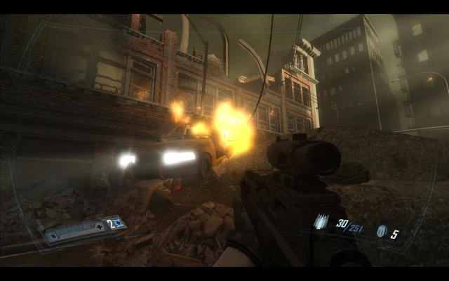 Podgląd na otoczenie ze środka jest nieco ziarnisty, w szczególności kiedy pociski zaczynają przeszywać każdy kąt. Opisywany wyżej pojazd kontroluje się jak ciężki czołg w dobrym tego słowa znaczeniu. Kiedy po raz pierwszy zapoznałem się z informacjami dotyczącymi tych mechanicznych robotów, natychmiast przekreśliłem ich szanse, określając mianem zupełnie niepotrzebnych w tego typu grze. Teraz jednak, po dogłębnych testach muszę przyznać, że kontrolowanie ich sprawia mnóstwo frajdy, a próba unieszkodliwienia takiego pojazdu przy pomocy normalnej broni to fantastyczna sprawa.