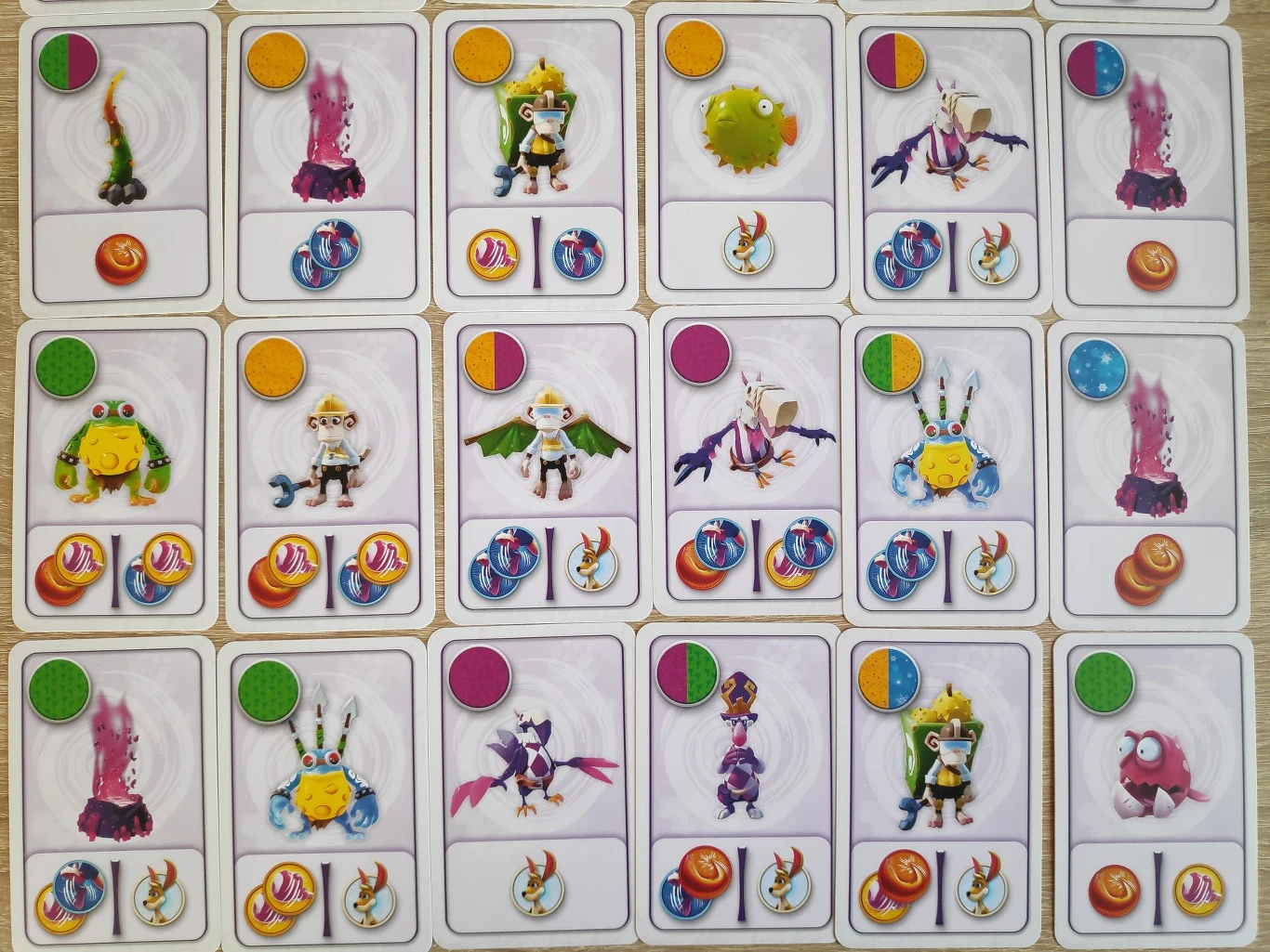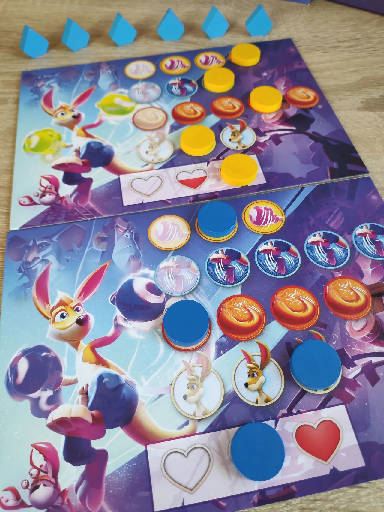 Przejdźmy teraz do naszych kangurzych bohaterów. Każdy z graczy dysponuje jedną planszetką z kangurkiem w kolorze: niebieskim, żółtym, czerwonym lub żółtym. Na planszetce mamy informacje o tym jak silna jest nasza postać. Opisują to znaczniki: piąchy, skoku, uderzenia ogonem oraz symbol kangurka. Ponadto jest tu także znacznik z liczbą punktów życia kangurka.