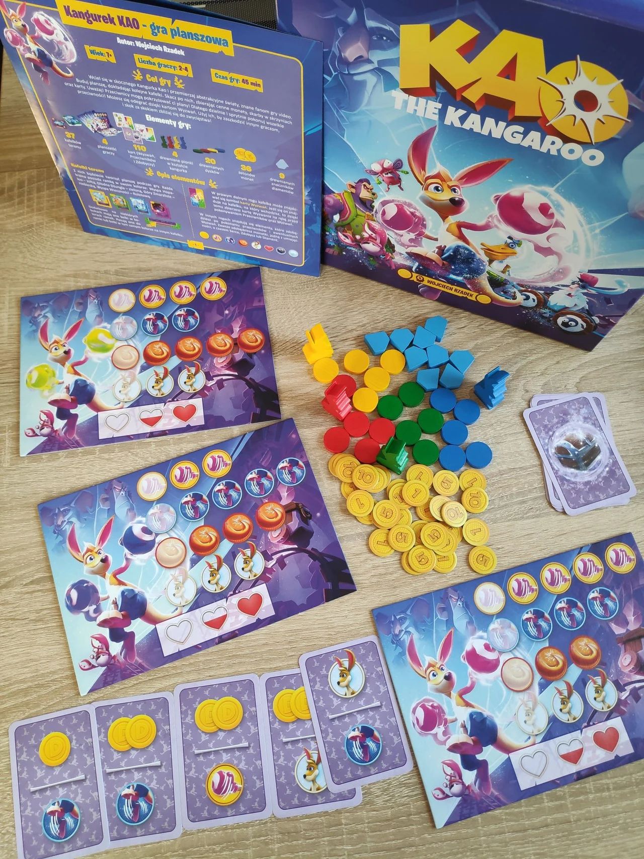 Kangurek KAO w wersji planszowej to gra stworzona przez autora Wojciecha Rzadka dedykowana dla 2-4 graczy. W zaleceniach twórców możemy wyczytać, iż jedna partia powinna potrwać ok. 45 minut. Po kilku rozgrywkach przychylamy się do tego, podobnie z resztą też do sugestii wiekowej - siedmioletnie dzieci jak najbardziej powinny odnaleźć się w tej grze.