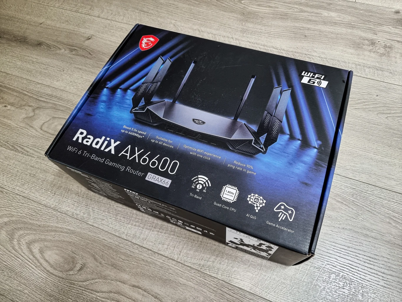 MSI RadiX AX6600 jest routerem trzypasmowym klasy Wi-Fi 6 AX6600, co oznacza, że jego łączna prędkość wynosi 6600 Mb/s. Szczegółowo rozłożone na poszczególne pasma, prędkości wynoszą: 574 Mb/s dla 2,4 GHz, 1201 Mb/s dla pierwszego pasma 5 GHz i 4804 Mb/s dla drugiego pasma 5 GHz (co ma zastosowanie głównie gamingowe). Wewnątrz urządzenia znajduje się czterordzeniowy procesor od Qualcomm o częstotliwości taktowania 1,8 GHz, a dodatkowo 512 MB pamięci RAM i 256 MB pamięci flash, co gwarantuje wysoką wydajność urządzenia, nawet przy dużym obciążeniu. Router wyposażono w sześć anten, cztery gigabitowe złącza LAN, jedno 2,5-gigabitowe złącze WAN/LAN oraz pojedynczy port USB 3.0.