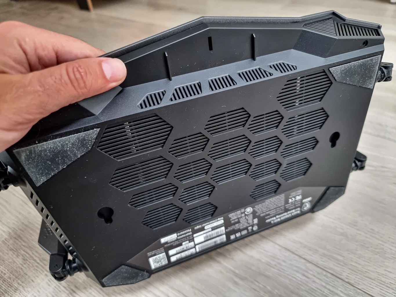 Jeśli chodzi o ergonomię, na górnej pokrywie routera znajdują się przyciski, diody oraz logo MSI. Spód urządzenia zawiera podkładki antypoślizgowe, otwory umożliwiające montaż na ścianie lub suficie oraz naklejkę z domyślnymi danymi do logowania. Warto zwrócić uwagę na liczne otwory, które ułatwiają cyrkulację powietrza, co jest kluczowe dla utrzymania optymalnej temperatury pracy urządzenia. Podłączenie routera to kwestia paru minut i powinien sobie z nią poradzić każdy, niezależnie od stopnia zaawansowania.