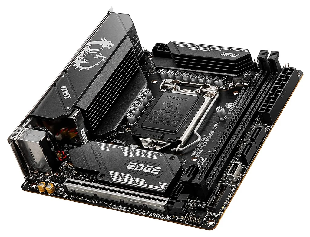 Z kolei MPG B560I GAMING EDGE WIFI to, jak wspomnieliśmy wcześniej, kompaktowa konstrukcja w standardzie Mini-ITX. Za chłodzenie VRM i chipsetu ponownie odpowiadają trzy radiatory bez dodatkowych wentylatorów i rurek heatpipe. Do dyspozycji użytkownika oddano trzy 4-pinowe gniazda wentylatorów, umieszczone w górnej części laminatu i wspierające regulację PWM oraz napięciową, dzięki czemu bez względu na to, jakie wentylatory zostaną do nich podłączone, nie będzie problemów z pracą półpasywną. Przechodząc do sekcji zasilania, mamy do czynienia z ośmiofazowym rozwiązaniem, z odpowiednio sześcioma fazami dla rdzeni oraz dwoma dla zintegrowanego GPU. VRM bazuje na kontrolerze PWM RT3609BE produkcji Richtek oraz MOSFET-ach FDMF3035, od ON Semiconductor i o obciążalności 50 A. Jako, że kontroler potrafi natywnie pracować w układzie 6+2, wszystkie fazy są rzeczywiste bez potrzeby stosowania dodatkowych układów.
