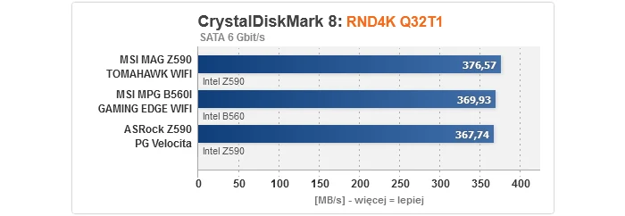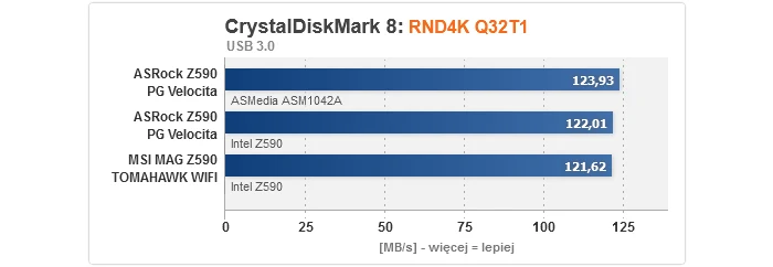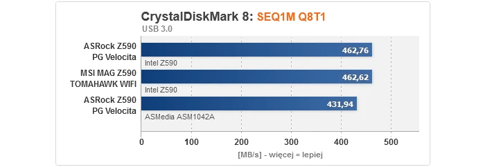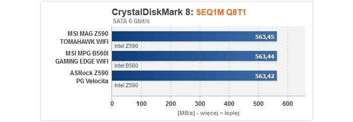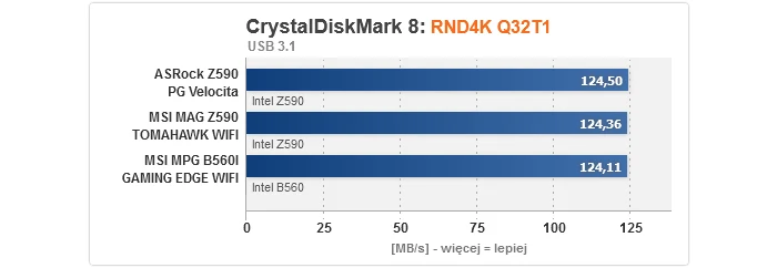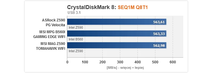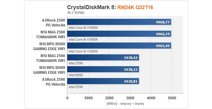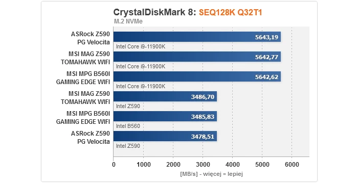 Zaczynając od rezultatów dla kontrolerów, nie mamy się do czego przyczepić. Bez względu na to, czy popatrzymy na M.2, SATA, czy też USB, wszystkie przetestowane płyty główne prezentują równy, optymalny poziom. Gwoli ścisłości, transfery dla dysku M.2 są niższe w przypadku podłączenia go do slotu obsługiwanego przez chipset z uwagi na przytoczony wcześniej fakt, że obsługę PCIe 4.0 zapewnia wyłącznie procesor, przez co w takim wypadku nawet jeśli nośnik jest kompatybilny ze standardem 4.0, jego szybkość i tak zostanie ograniczona do 3.0 (to niestety wada platformy Intela na tle AMD, gdzie mostek X570 normalnie wspiera 4.0).