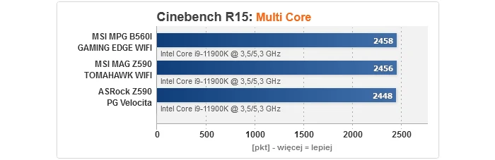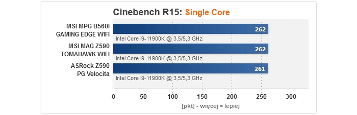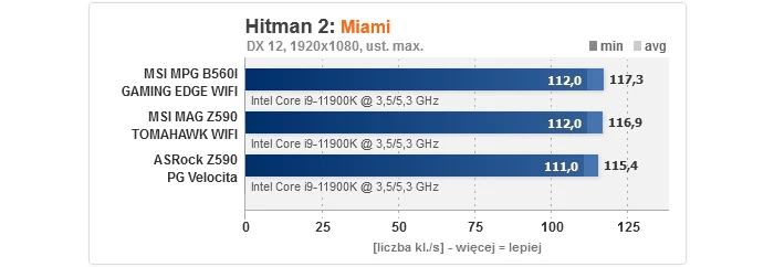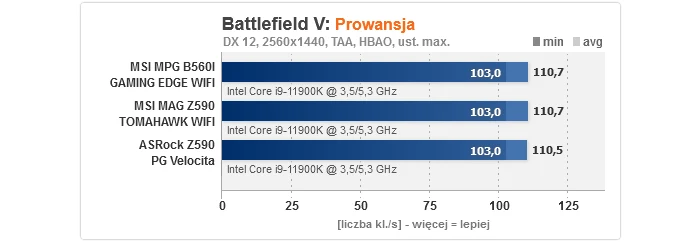 Niewątpliwie ta część testów jest najbardziej interesująca, gdyż w sieci nie brakuje doniesień, że na wielu płytach B560 osiągi w grach i aplikacjach potrafią być wyraźnie gorsze od modeli na Z590. I nie są to wyssane z palca domysły, tylko tak naprawdę jest, gdyż sporo tanich konstrukcji nie może się pochwalić dobrymi sekcjami zasilania - wręcz montuje się tam naprawdę kiepskie komponenty VRM i właśnie to prowadzi do tzw. throttlingu, czyli degradacji wydajności. Jak widać na wykresach, w przypadku MPG B560I GAMING EDGE WIFI nic takiego nie ma miejsca i rezultaty są dokładnie takie, jak być powinny, tj. w niczym nie odstają od konkurencji opartej o Z590, pomimo użycia w testach topowego Core i9-11900K.