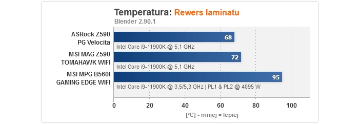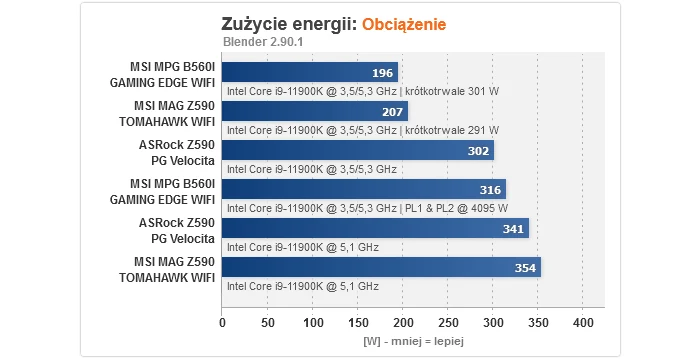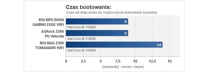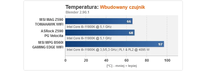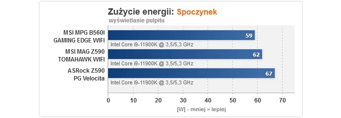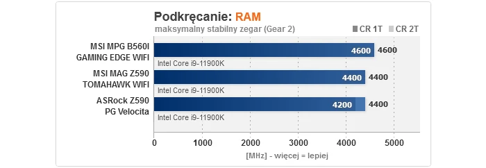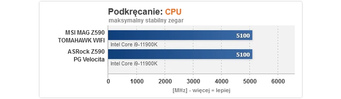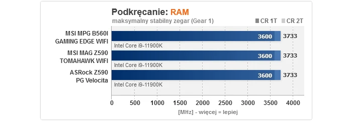 Zaczynając od czasu uruchamiania, w przypadku modelu na B560 jest on bardzo szybki, podczas gdy MAG Z590 TOMAHAWK WIFI bootuje 5 s wolniej - to wciąż akceptowalny wynik, ale jednak gorszy. Podkręcanie procesora wypadło bez zarzutu, gdyż 5100 MHz to optimum dla naszego sampla przy napięciu 1,375 V, jakie obowiązuje podczas OC, podczas gdy dla pamięci RAM cała trójka w trybie synchronicznym potrafiła uzyskać 3733/3600 MHz, odpowiednio z CR na 2T i 1T (ponownie to dobre rezultaty). Dość interesująco wygląda za to overclocking RAM w trybie 1:2, tj. z kontrolerem pracującym o połowę wolniej, gdzie MPG B560I GAMING EDGE WIFI pokonała obie płyty Z590, aczkolwiek trzeba dodać, że to sztuka dla sztuki, gdyż z punktu widzenia wydajności sensowny jest tylko wariant synchroniczny. Odnośnie zużycia energii, obie konstrukcje MSI mogą się pochwalić niskim poborem prądu w spoczynku, z kolei testy temperatury wykazały, że MAG Z590 TOMAHAWK WIFI bez problemów poradziła sobie z podkręconym Core i9-11900K (ok. 70 °C), a dla MPG B560I GAMING EDGE WIFI nawet zdjęcie limitów mocy ze wspomnianego CPU nie stanowiła wyzwania ponad siły i to bez dodatkowego nawiewu na sekcji (nie miały go też zapewnione pozostały płyty).