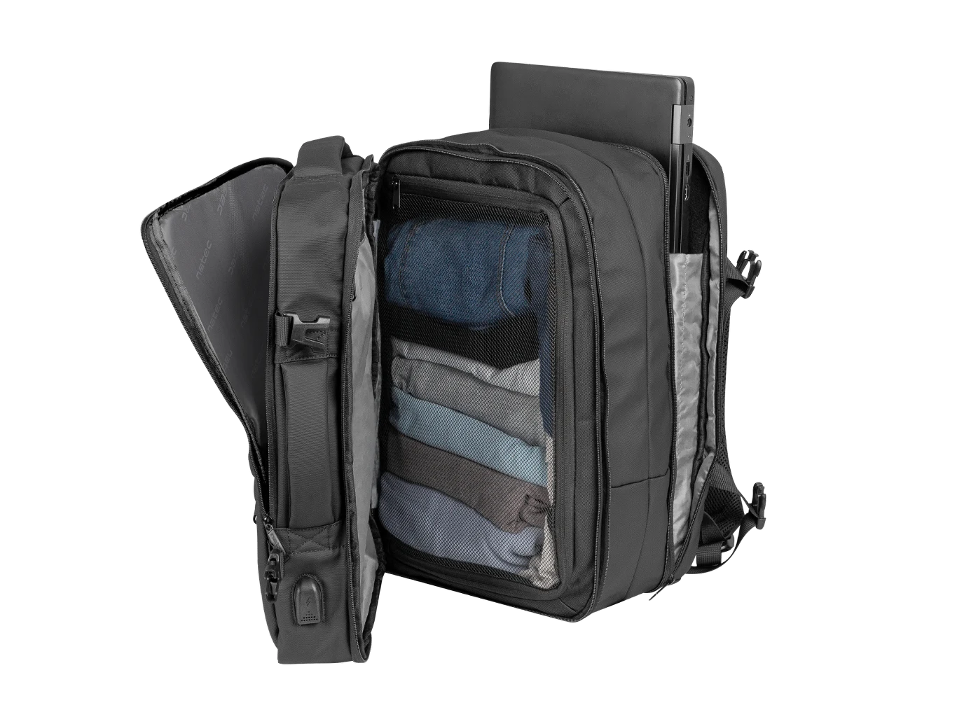 Jednym z kluczowych atutów Natec Camel Pro jest jego mnogość zastosowań. Możliwość łatwej transformacji plecaka z kompaktowego wariantu do wersji zwiększającej jego pojemność o 10 cm jest odpowiedzią na wyzwania związane z różnorodnością i dynamiką współczesnych podróży. Taka elastyczność pozwala na spakowanie większej ilości przedmiotów, niezbędnych podczas dłuższych wyjazdów, w tym laptopa o przekątnej do 17,3 cala, akcesoriów czy nawet ubrań czy bielizny na kilka dni. Główna komora plecaka, otwierająca się jak walizka, znacząco ułatwia organizację i dostęp do zawartości - to rozwiązanie, które docenicie w podróżach.