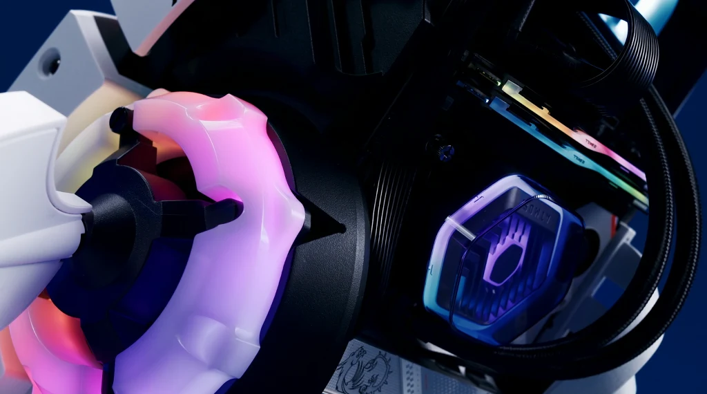 Obudowa oferuje głównie biało-czarną paletę kolorystyczną i obsługuje płytę główną mini-ITX. Zewnętrzne elementy od dołu do góry pokryte są światełkami ARGB, które możemy dowolnie konfigurować. W środku znajdzie się sporo miejsca na pełnowymiarową kartę graficzną i chłodzenie cieczą.