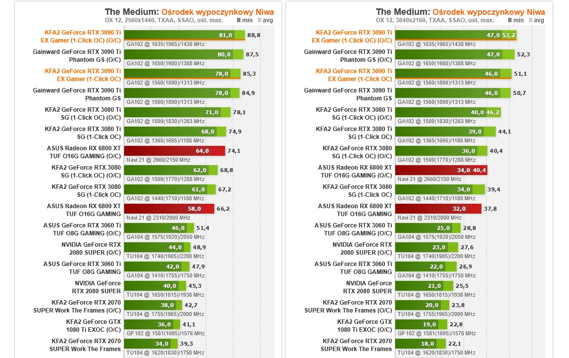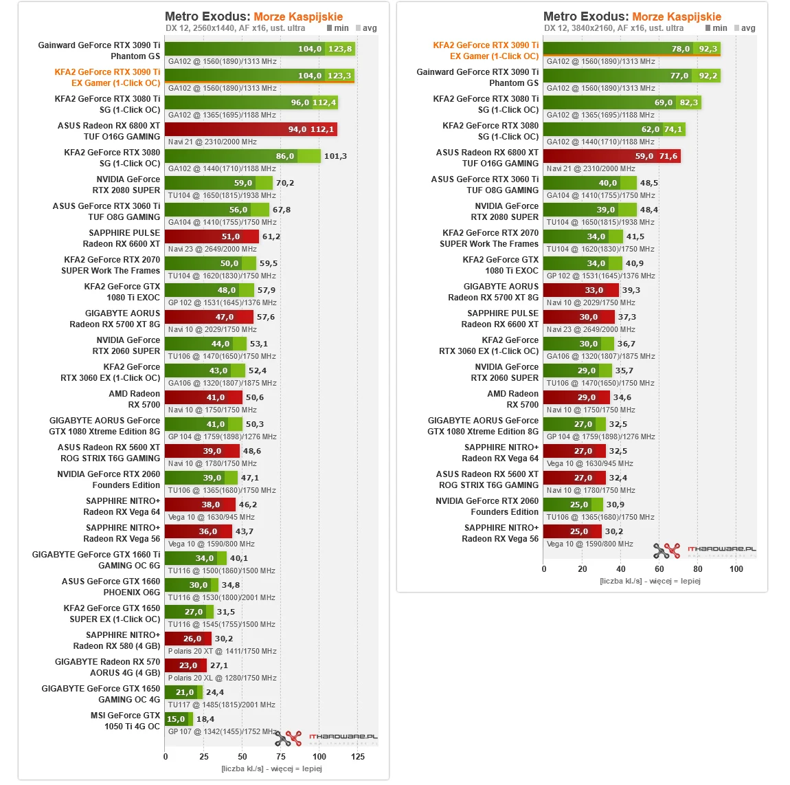 Jak widać na wykresach, KFA2 GeForce RTX 3090 Ti EX Gamer (1-Click OC) idzie łeb w łeb z testowanym wcześniej Gainwardem Phantom GS. Nic jednak dziwnego, ponieważ obie karty pochwalić mogą się identycznym taktowaniem, a różnica limitów mocy to tylko 10 W na korzyść tego drugiego. Różnica na poziomie 0,8% to typowa dysproporcja związana z różnicą jakości krzemu w konkretnych egzemplarzach kart. Potencjał podkręcania również i w tym wypadku jest skromny, ponieważ rdzeń udało się nam przyspieszyć o symboliczne raczej 75 MHz, a pamięć do 1438 MHz, co wraz z limitem mocy podbitym do 480 W, przełożyło się na średni wzrost osiągów o 4,2%.