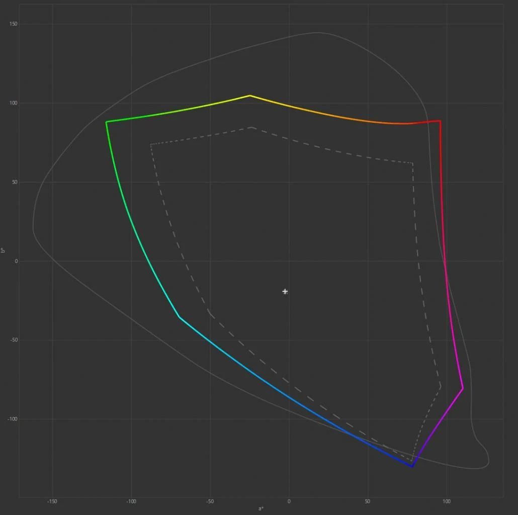 Pochwalić należy tutaj średni błąd Delta E, który dla testowanego modelu wyniósł zaledwie 2,4 i wspomnieć trzeba, że wynik poniżej 3 jest uznawany za bardzo dobry. Maksymalne odchylenia mogłyby być niższe, ale nadal mówimy tutaj o wartościach znacznie niższych niż w niektórych konkurencyjnych modelach (maksymalnie 4,66).