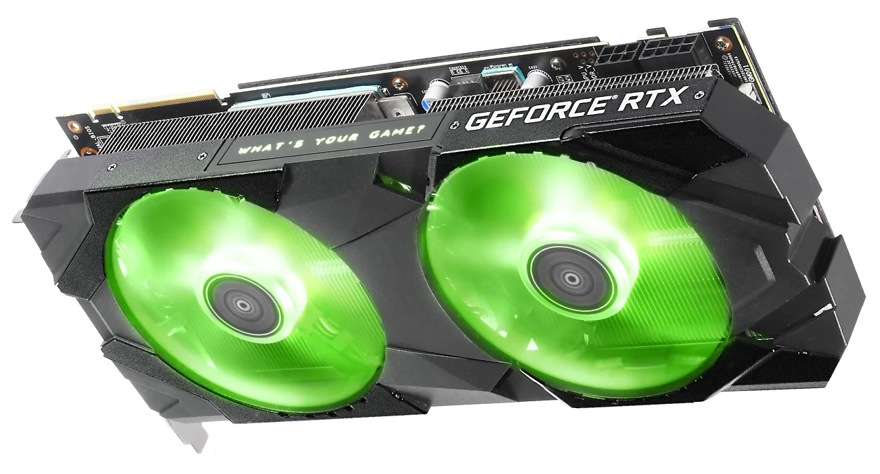 Testowana KFA2 GeForce RTX 2070 SUPER EX (1-Click OC) to konstrukcja o typowej długości, wynoszącej około 29 cm, i zajmująca w komputerze trzy sloty, z uwagi na sporą wysokość chłodzenia (sam śledź jest dwuslotowy). Za wymuszanie przepływu powietrza odpowiadają dwa wentylatory o średnicy 100 mm, które pracują w trybie półpasywnym, zaś radiator to dwa niezależne bloki aluminium, w celu przyspieszenia transferu ciepła wykorzystujące łącznie pięć ciepłowodów. Jeśli chodzi o gniazda zasilania, mamy po sztuce 6-pin oraz 8-pin, a ponadto warto podkreślić wielobarwne podświetlenie diodami LED, które obejmuje wentylatory oraz napis What's Your Game na osłonie chłodzenia. Na śledziu wylądowały trzy sztuki DisplayPort 1.4 oraz pojedyncze wyjście HDMI 2.0b.