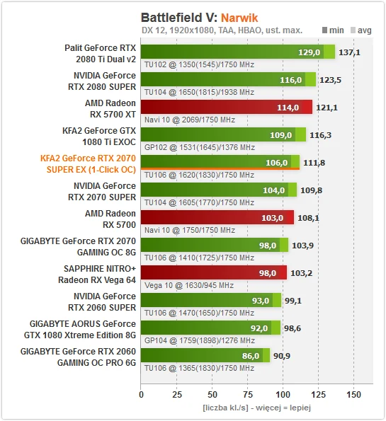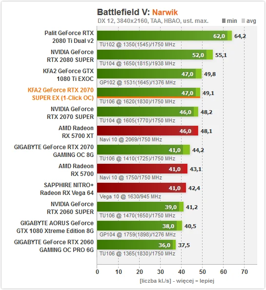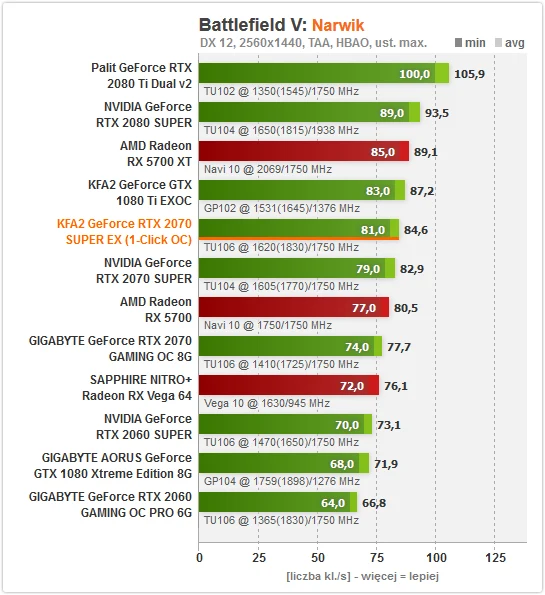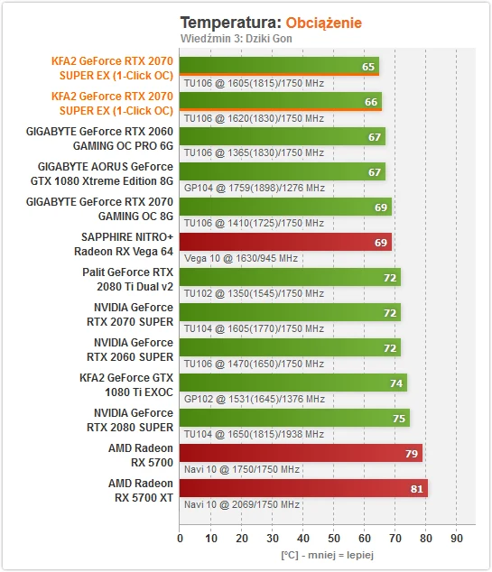 Zaczynając od wydajności, przeprowadzone testy pokazały, że KFA2 GeForce RTX 2070 SUPER EX (1-Click OC) to akcelerator w minimalnym stopniu wydajniejszy od referencyjnej konstrukcji Founders Edition. Przekrojowo możemy liczyć na około 2% wyższe osiągi, co nie powinno dziwić, biorąc pod uwagę, że mamy do czynienia z niewielkim fabrycznym overclockingiem. Skoro jesteśmy już przy podkręcaniu, gwoli ścisłości warto dodać, że ta konkretna sztuka była w stanie uzyskać rzeczywiste taktowanie rdzenia pod obciążeniem wynoszące 2070 MHz, a to dobry wynik. Z kolei pamięci zatrzymały się na 1950 MHz, co - jak na kości Microna - jest rezultatem nieodbiegającym od średniej.