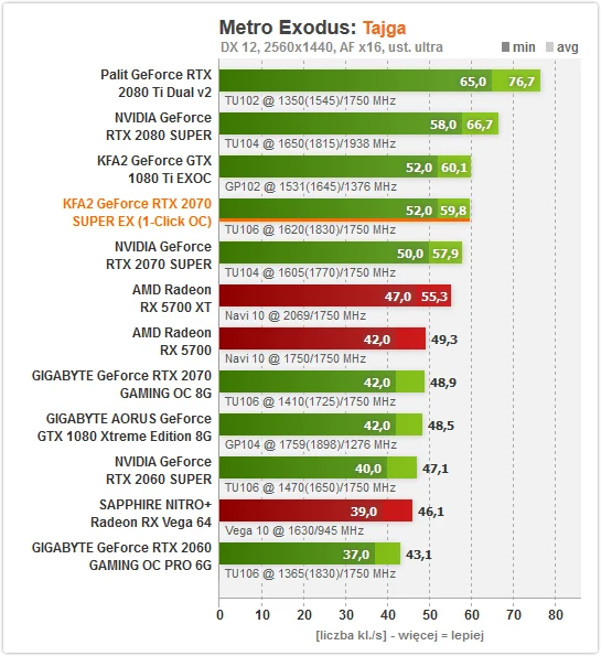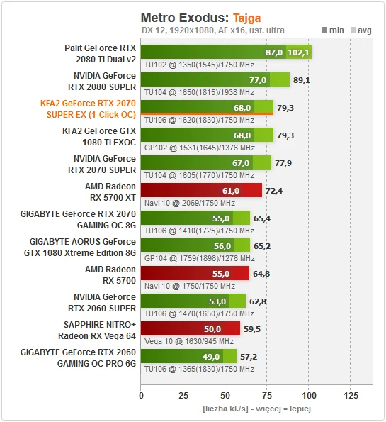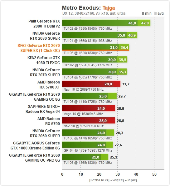 Kolejna gra to Metro Exodus, a więc następny taśmowiec, chociaż oczywiście wydawany z mniejszą częstotliwością, tym razem od ukraińskiego studia 4A Games. Jak na topową produkcję spod skrzydeł NVIDII przystało, tytuł ten wspiera zarówno śledzenie promieni, jak i wygładzanie krawędzi DLSS. Aczkolwiek techniki te pozostają nieaktywne w ramach testów, które odbywają się mapie Tajga, będącej jedną z najbardziej wymagających lokacji w całej grze. Oznacza to, że przez większość czasu liczba FPS powinna być wyższa od zanotowanych wartości.