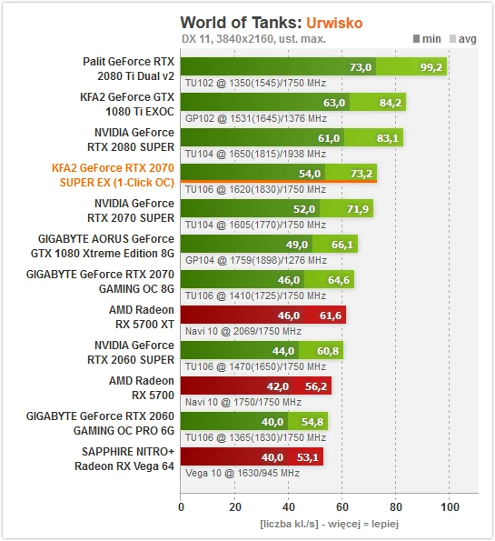 Na deser mamy zaś bardzo popularne sieciowe zmagania czołgistów, czyli esportową World of Tanks od Wargaming.net. Opisywana gra rzecz jasna nie należy do grona zabójców najnowszych procesorów czy kart graficznych, głównie ze względu na swój masowy charakter, który sprawia, że ma po prostu działać na możliwie szerokiej palecie komponentów, także tych starszych. Niemniej jednak, mając odpowiednio mocny sprzęt, możemy pokusić się o rozgrywkę w rozdzielczości 4K, do czego GeForce RTX 2080 SUPER nadaje się w zupełności przyzwoicie.