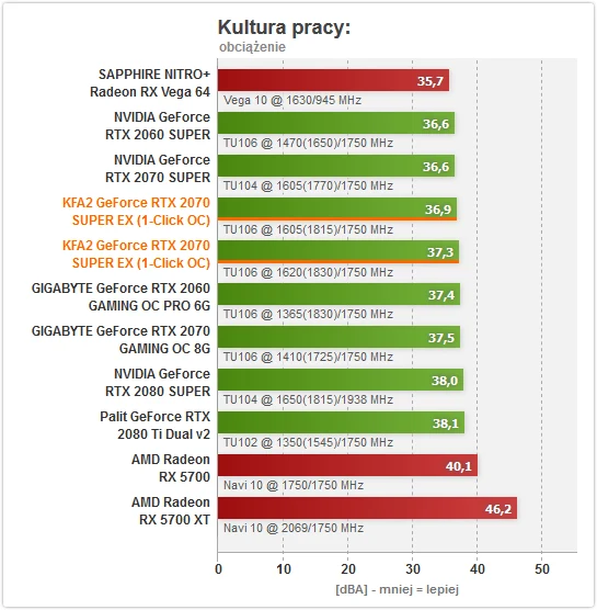 Fabryczny układ chłodzenia recenzowanej KFA2 GeForce RTX 2070 SUPER EX (1-Click OC) to bardzo dobre rozwiązanie, zapewniające niskie temperatury przy rozsądnym poziomie hałasu, marginalnie wyższym od modelu Founders Edition. Pod obciążeniem zanotowaliśmy 65 °C (z włączonym 1-Click OC było to 66 °C), przy wskazaniach decybelomierza na poziomie 36,9/37,3 dBA, odpowiednio dla nieaktywnej oraz włączonej przed chwilą wskazanej opcji. Mówimy więc o wartościach, odnośnie których trudno mieć jakiekolwiek uwagi.