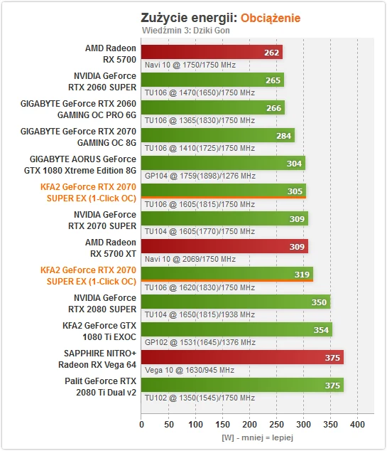Jeżeli natomiast chodzi o pobór prądu, to prosto po wyjęciu z pudełka testowany akcelerator sprawuje się w tym aspekcie identycznie jak referencyjny Founders Edition, co nie powinno dziwić, biorąc pod uwagę, że obie karty graficzne mają fabryczny limit mocy (ang. power limit) ustawiony na identyczną wartość 215 W. Sytuacja zmienia się dopiero w momencie aktywacji 1-Click OC, jako że opcja ta nie tylko podbija zegar Boost o 15 MHz, ale również podnosi power limit do poziomu 240 W. W efekcie zużycie energii nieco rośnie, ale w zamian zyskujemy stabilniejsze taktowanie przy dużej liczbie pikseli, gdyż wzrost rozdzielczości powoduje dodatkowe dociążenie GPU.