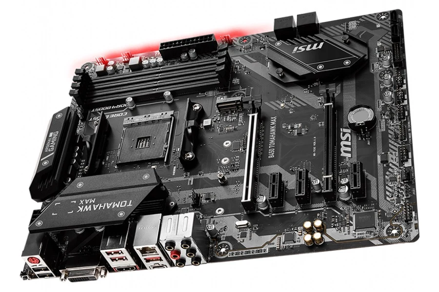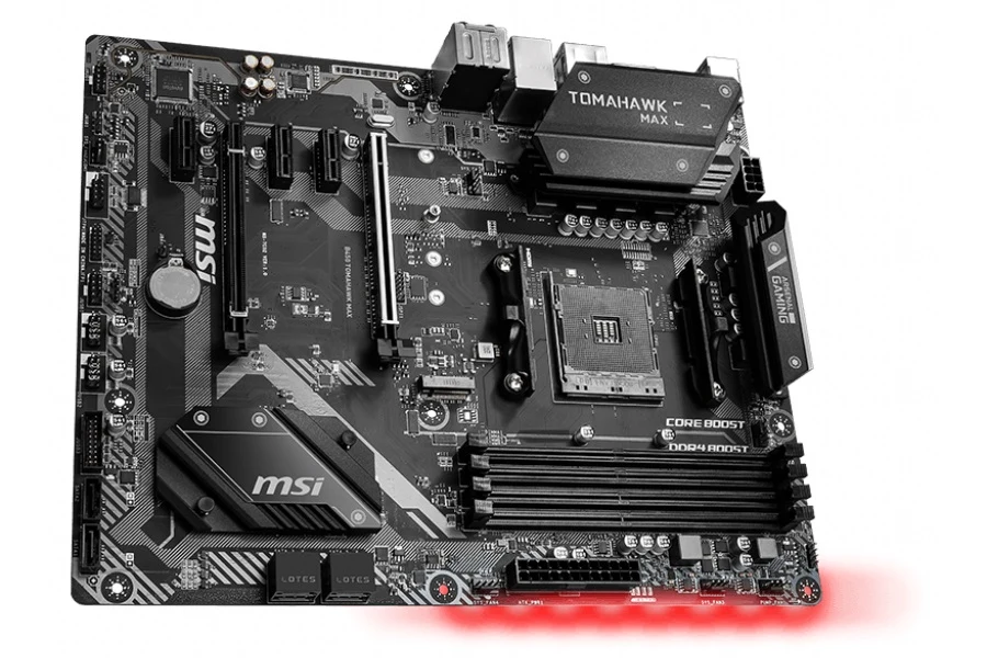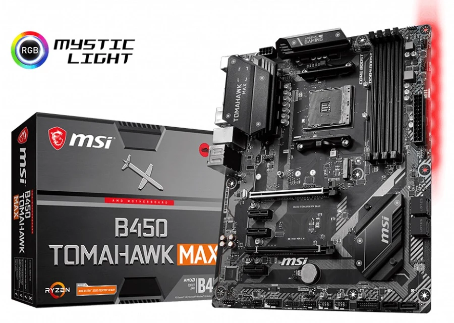 MSI B450 TOMAHAWK MAX to przystępna cenowo płyta główna, którą znajdziecie w sklepach już od około 460 zł. W tych pieniądzach dostaniecie wszystko co potrzebne do złożenia nowoczesnego i wydajnego komputera, naturalnie w wydaniu, które nie podnosi niepotrzebnie kosztu zakupu. Na laminacie wylądowało sporo slotów PCI Express, sześć portów SATA, złącze M.2, zintegrowane audio oraz LAN oparte na układach Realteka, a także gniazda USB zgodne ze standardem w wersji 3.1 (wg obecnej nomenklatury 3.2 Gen 2). Ponadto mamy ciekawą linię stylistyczną operującą czernią oraz odcieniami szarości, czy też diody LED przy prawej krawędzi PCB, łącznie z obsługą dodatkowych pasków. Tak więc jak na dłoni widać, że firma MSI pewnie podąża za dzisiejszymi trendami.