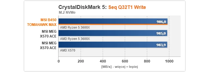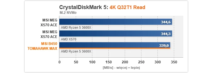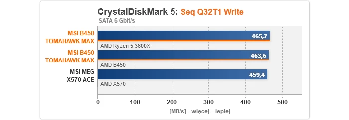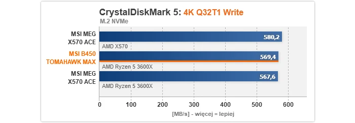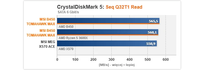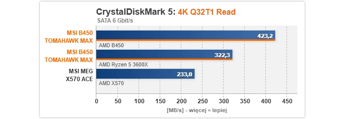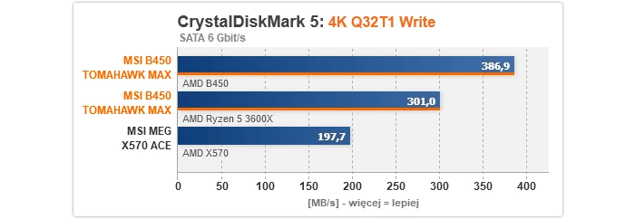 Część praktyczną rozpoczynamy od pomiarów dotyczących podsystemu dyskowego. Rezultaty okazały się bardziej niż interesujące, głównie z uwagi na to, jak dużą przewagę dla portów SATA potrafi zanotować starszy mostek B450 nad topowym X570. Dysproporcja dotyczy głównie operacji na małych plikach (próbka 4K) i od razu musimy zaznaczyć, że nie jest to problem wykorzystanej płyty głównej, lecz ogólna przypadłość konstrukcji na tym chipsecie, wynikające ze słabości kontrolera wchodzącego w skład struktury krzemowej. Natomiast dla złącz M.2 rozbieżności okazały się kosmetyczne, niemające żadnego wpływu na funkcjonowanie komputera.