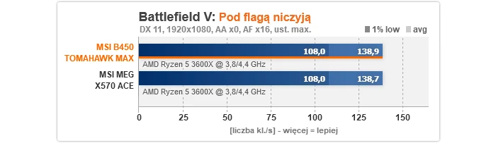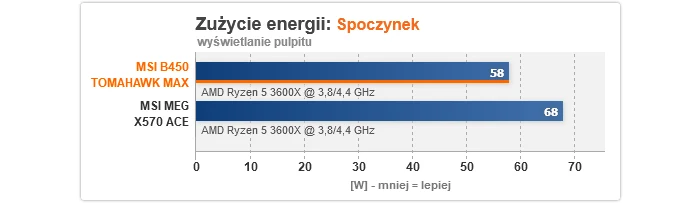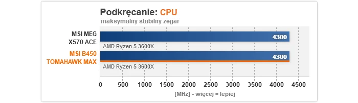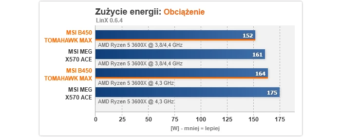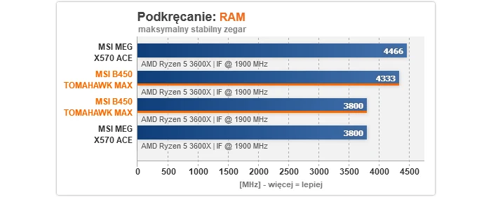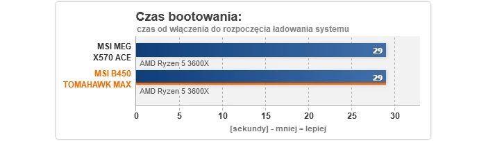 Czas bootowania niewątpliwie nie należy do mocnych stron MSI B450 TOMAHAWK MAX, gdyż zanotowany wynik to niemal pół minuty. Jednak trzeba dodać, że jest to przypadłość płyt głównych tego producenta w ogólności i nie ogranicza się tylko do tego jednego modelu. Z kolei podkręcanie wypadło doskonale - udało się wyciągnąć maksimum potencjału z procesora, a także solidnie przyspieszyć pamięć RAM, w trybie asynchronicznym do grubo ponad 4000 MHz. W tym właśnie miejscu warto również podkreślić kolejną zaletę chipsetu B450 na tle X570, którą jest nieco niższe zużycie energii elektrycznej (o około 10 W).