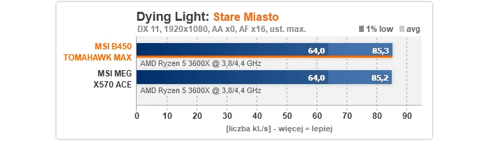 Reasumując, MSI B450 TOMAHAWK MAX to konstrukcja oferująca możliwości wystarczające typowemu użytkownikowi, za sprawą obsługi wszystkich nowoczesnych standardów, atrakcyjna wizualnie i bardzo dobrze spisująca się w praktyce. Do drobnych minusów można zaliczyć dość długi czas bootowania, niezbyt fortunne umiejscowienie złącza M.2 oraz audio na kodeku Realtek ALC892, gdyż nowszy i lepszy ALC1220 byłby jednak mile widziany. Ze względu na to, że jest to nowość, mamy nadzieję, że za jakiś czas potanieje i będzie można ją dostać poniżej 450 zł. Biorąc pod uwagę, że ceny bliźniaczej B450-A PRO MAX zaczynają się od niespełna 400 zł, jak najbardziej są na to perspektywy. Obserwujcie więc sytuację, gdyż recenzowany model zdecydowanie warto mieć na uwadze.