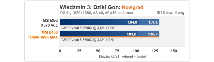 Osiągi w testach rzeczywistych są dla porównywanej dwójki w zasadzie identyczne, co w żadnym wypadku nie powinno dziwić. Obie płyty główne były testowane przy wgranych najnowszych wersjach BIOS-ów, z mikrokodem AGESA 1.0.0.3ABBA, a więc zawierającym poprawki pod kątem zegarów Boost. W praktyce, nawet gdybyśmy wzięli konstrukcje na jeszcze innych chipsetach, dysproporcje między nimi i tak będą kosmetyczne, oczywiście pod warunkiem tego samego wydania AGESA. Jest to jak najbardziej zgodne ze stanowiskiem AMD, które twierdzi, że wydajność Ryzenów 3000 nie zależy od mostka południowego (bo niby dlaczego miałaby zależeć?).