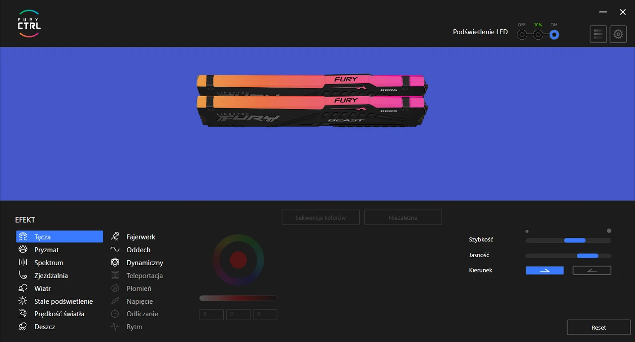 Wspomnijmy również o sferze wizualnej. Moduły Kingston Fury Beast RGB prezentują się.. cóż.. znakomicie. Podświetlenie jest jasne, bardzo dobrze współgra z czarnymi radiatorami, a użyty do wykończenia, matowy plastik efektownie je rozprasza. Tym dodatkowo możemy sterować z poziomu aplikacji Kingston FURY CTRL, a żeby tego było mało, podświetlenie obu modułów automatycznie się ze sobą synchronizuje przy pomocy podczerwieni, nawet wtedy, kiedy z aplikacji skorzystać nie chcemy.