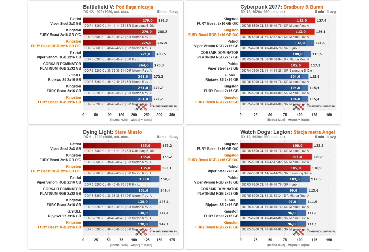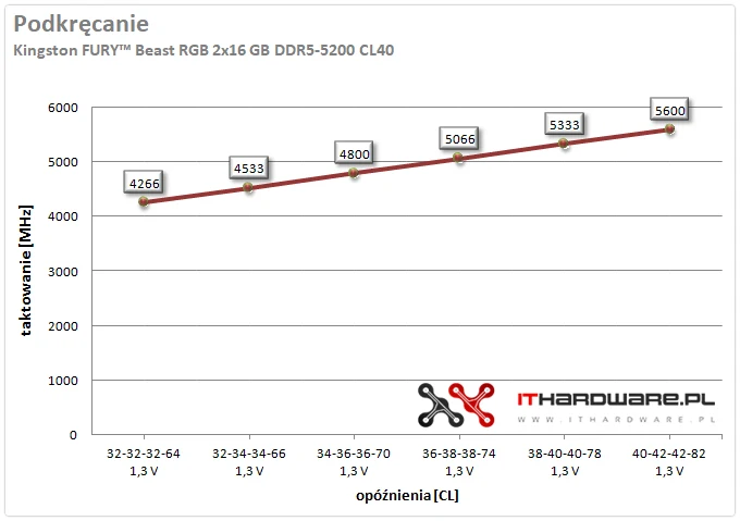 Testowana pamięć Kingston Fury Beast RGB może pochwalić się identycznymi parametrami fabrycznymi, jak jego odpowiednik bez dopisku RGB, którego zresztą mieliśmy okazję już przetestować. W obu przypadkach jest to 2x 16 GB DDR5-5200 CL 40-40-40-80 oba zestawy nie wyróżniają się na tle konkurenta niczym szczególnym. Co ciekawe, bohater dzisiejszego artykułu może pochwalić się nieco gorszymi wynikami po przetaktowaniu od zestawu bez RGB, ale jeśli spojrzeć na to z nieco szerszej perspektywy nie ma w tym nic zaskakującego, ponieważ rzeczą wręcz oczywistą jest, że trafiają się lepsze i gorsze egzemplarze tego samego sprzętu. Widać to przede wszystkim w trakcie testowania procesorów, gdzie różnica w potencjale OC może się różnić jeszcze bardziej. Decydując się na OC recenzowanego zestawu pamięci, możemy albo obniżyć opóźnienia przy fabrycznym taktowaniu, albo podnieść zegar do 5600 MHz przy nieco luźniej ustawionych timingach. Pod względem możliwości OC, zestaw wypada zauważalnie gorzej od na przykład Patriota Viper Venom, który bazuje już na kościach pamięci Hynix.