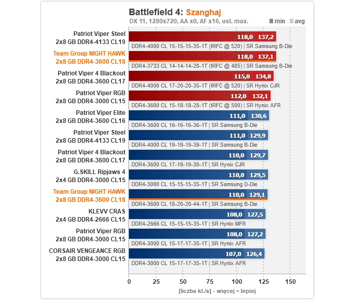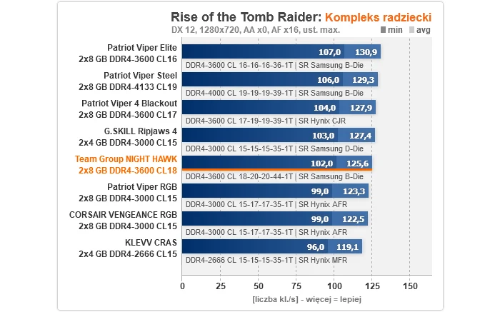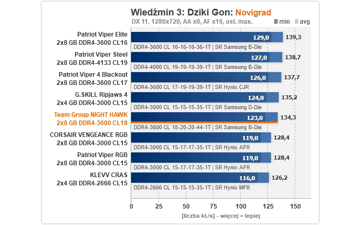 Testowane pamięci Team Group NIGHT HAWK RGB to produkt o dwóch twarzach. Z jednej strony mamy przeciętne osiągi przy ustawieniach fabrycznych, będące skutkiem asekuracyjnych timingów, a z drugiej zaś wyśmienity potencjał podkręcania, zapewniany przez kości Samsung B-Die. Ponadto moduły są świetnie wykonane, z dużymi i efektownie wyglądającymi, masywnymi radiatorami, a także mogą się pochwalić bardzo ładnym podświetleniem LED RGB. W związku z tym uważamy, że cena 510 zł jest jak najbardziej rozsądną, ale należy pamiętać, że nie jest to propozycja dla każdego, właśnie z uwagi na wspomniane opóźnienia. Jeżeli jednak lubicie takie świecidełka i niestraszna jest Wam optymalizacja ustawień we własnym zakresie, to jak najbardziej warto się nimi zainteresować.