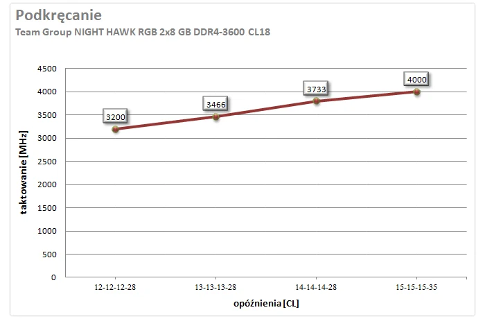 I w tym właśnie momencie dotarliśmy do drugiej, poza ciekawym wyglądem, bardzo istotnej zalety recenzowanego zestawu. Kości Samsung B-Die to niemal zawsze zwiastun wysokiego potencjału podkręcania i nie inaczej jest tym razem. Uzyskane rezultaty są znakomite, zarówno jeśli chodzi o możliwe do uzyskania zegary (przypominamy, że 4000 MHz to limit platformy testowej), jak i towarzyszące im opóźnienia. Jak widzicie na wykresie przedstawiającym rezultaty po zaaplikowaniu overclockingu, zdecydowanie jest o co walczyć, gdyż z dolnej części stawki testowane moduły przesunęły się na samą górę.